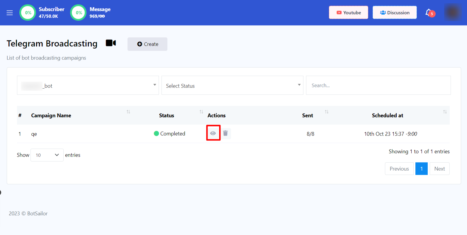 3. You can check Status, Targeted number of subscribers, Message Count and Sent report here.